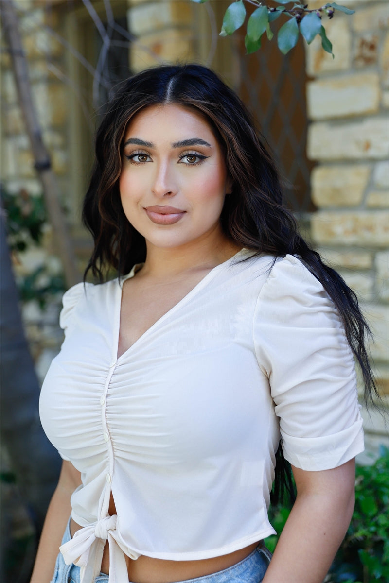 solid color, mesh material, front button up detail with self-tie, v-neckline, short sleeves with ruched detail, slim fit, unlined, stretchy, semi-sheer, casual, cute, stylish, girlish, must have