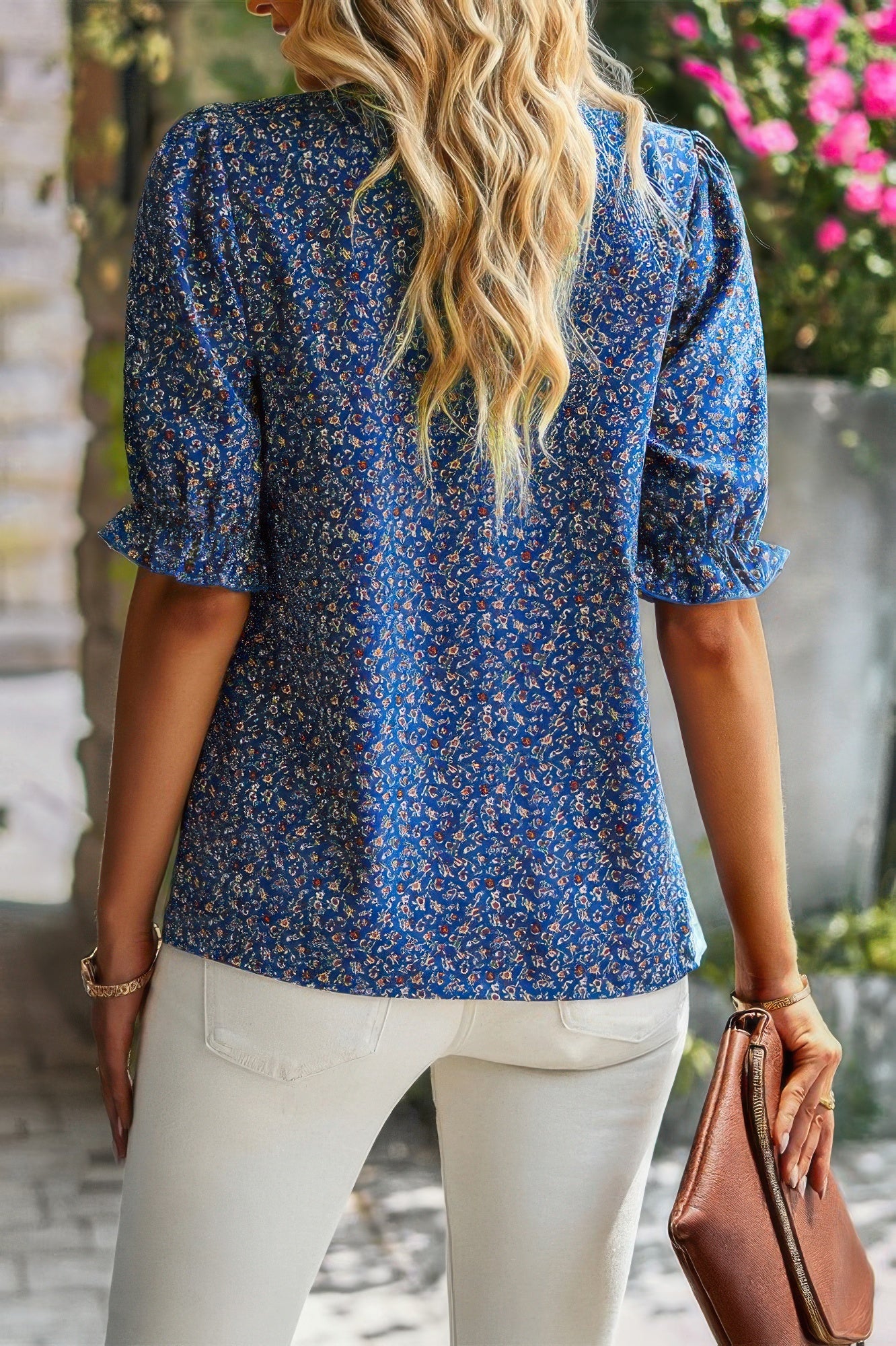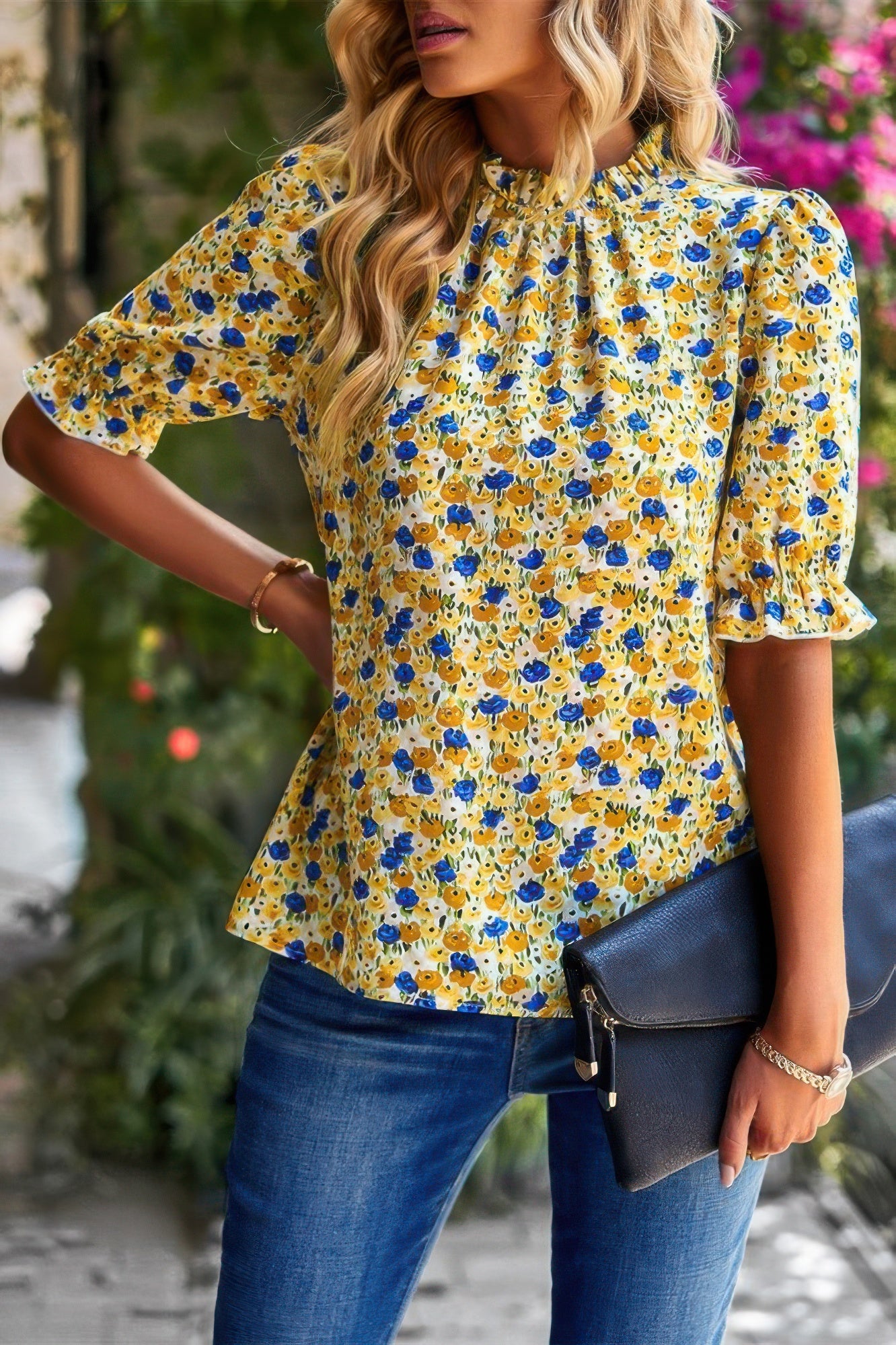 This floral ruffle mock neck puff short sleeve shirt is a charming addition to your wardrobe, capturing a perfect balance of boho elegance and playful sophistication. Made from 100% polyester, it offers a lightweight and breezy feel that’s perfect for sunny days. The mock neck with ruffle detailing adds a romantic touch, while the puff short sleeves create a soft, feminine silhouette. The floral print brings a hint of vintage-inspired charm, making it ideal for casual outings, vacations, or laid-back getaways. Pair it with your favorite denim or a flowy skirt for an effortlessly chic look.