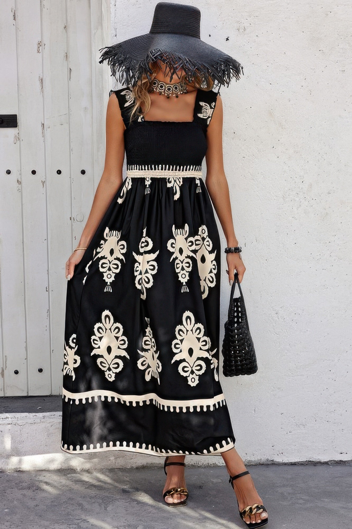 Sleeveless Square Neck A Line Smocked Shirred Dress
