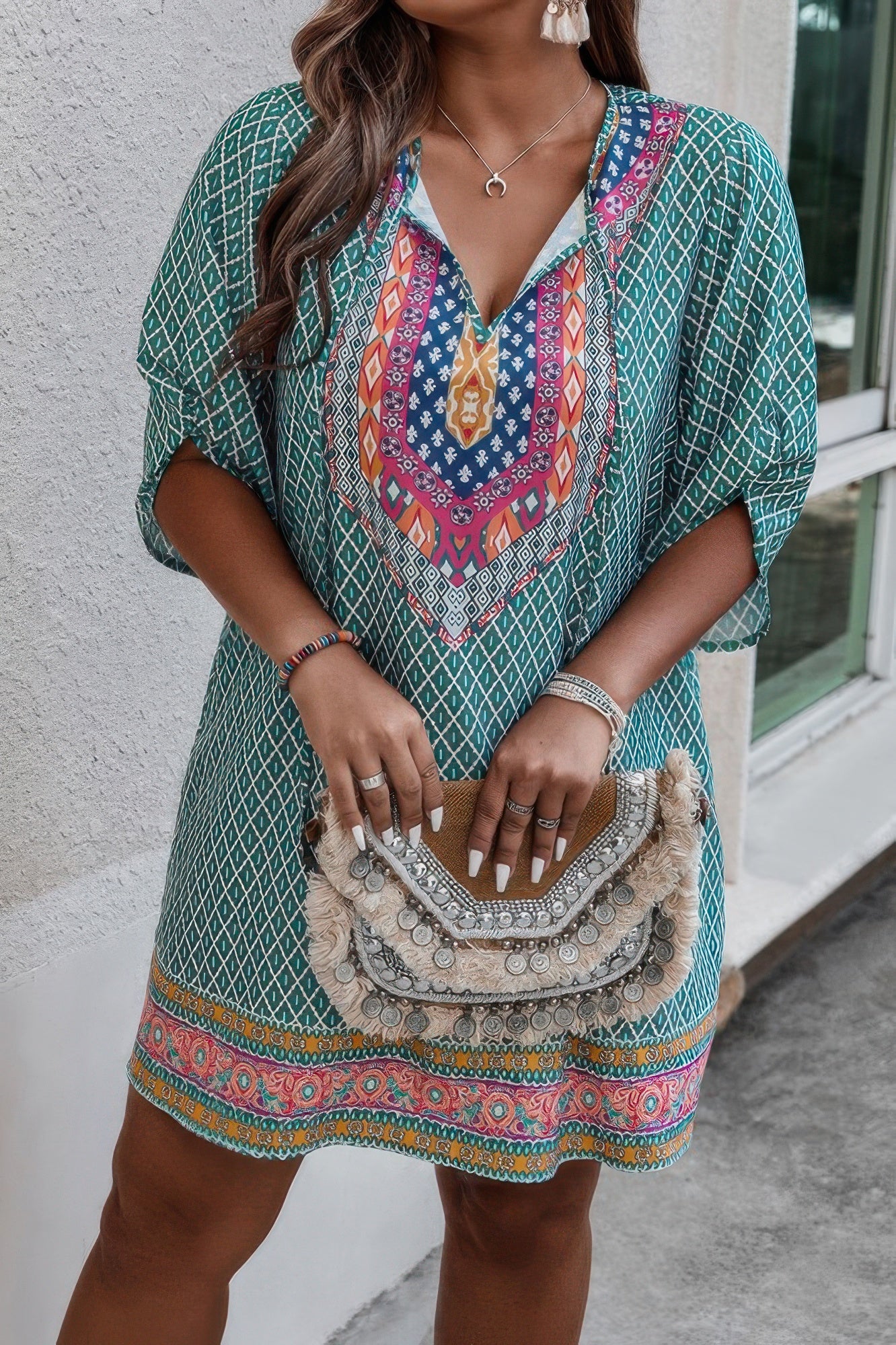 This plus size V-neck printed loose fit midi dress is a versatile and easygoing piece for your everyday adventures. Made from a soft, stretchy blend of 95% polyester and 5% elastane, it offers a lightweight and comfortable feel that moves with you. The V-neckline creates a flattering shape, while the loose fit drapes beautifully over your figure for a breezy, relaxed silhouette. With its playful print and midi length, this dress is perfect for casual outings, vacations, or just enjoying the day in style.