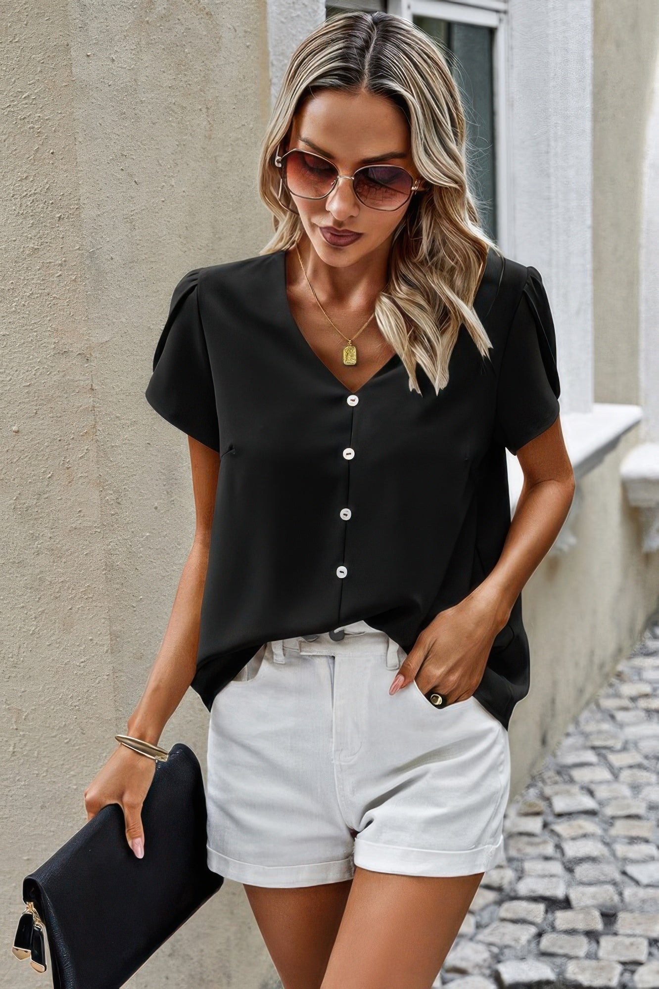 This solid button trim V-neck loose fit blouse is a breezy and feminine piece that adds effortless charm to your daily looks. Made from 100% polyester, it’s lightweight and comfortable for all-day wear. The delicate V-neckline and button trim details bring a subtle sophistication, while the loose fit keeps things relaxed and easygoing. Perfect for layering or wearing on its own, this blouse transitions seamlessly from casual outings to laid-back vacation days. Pair it with jeans, shorts, or skirts for a fresh, polished finish.