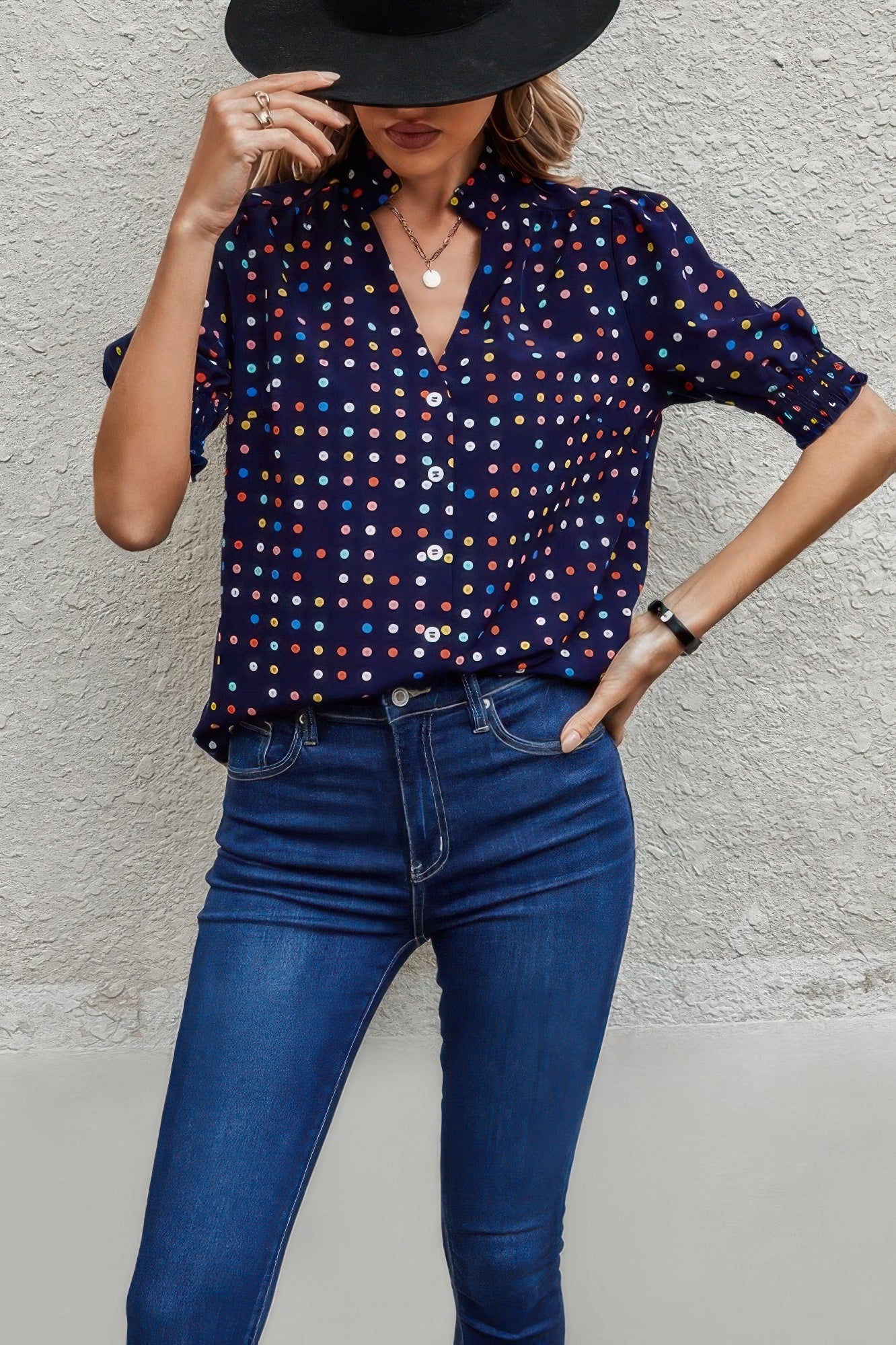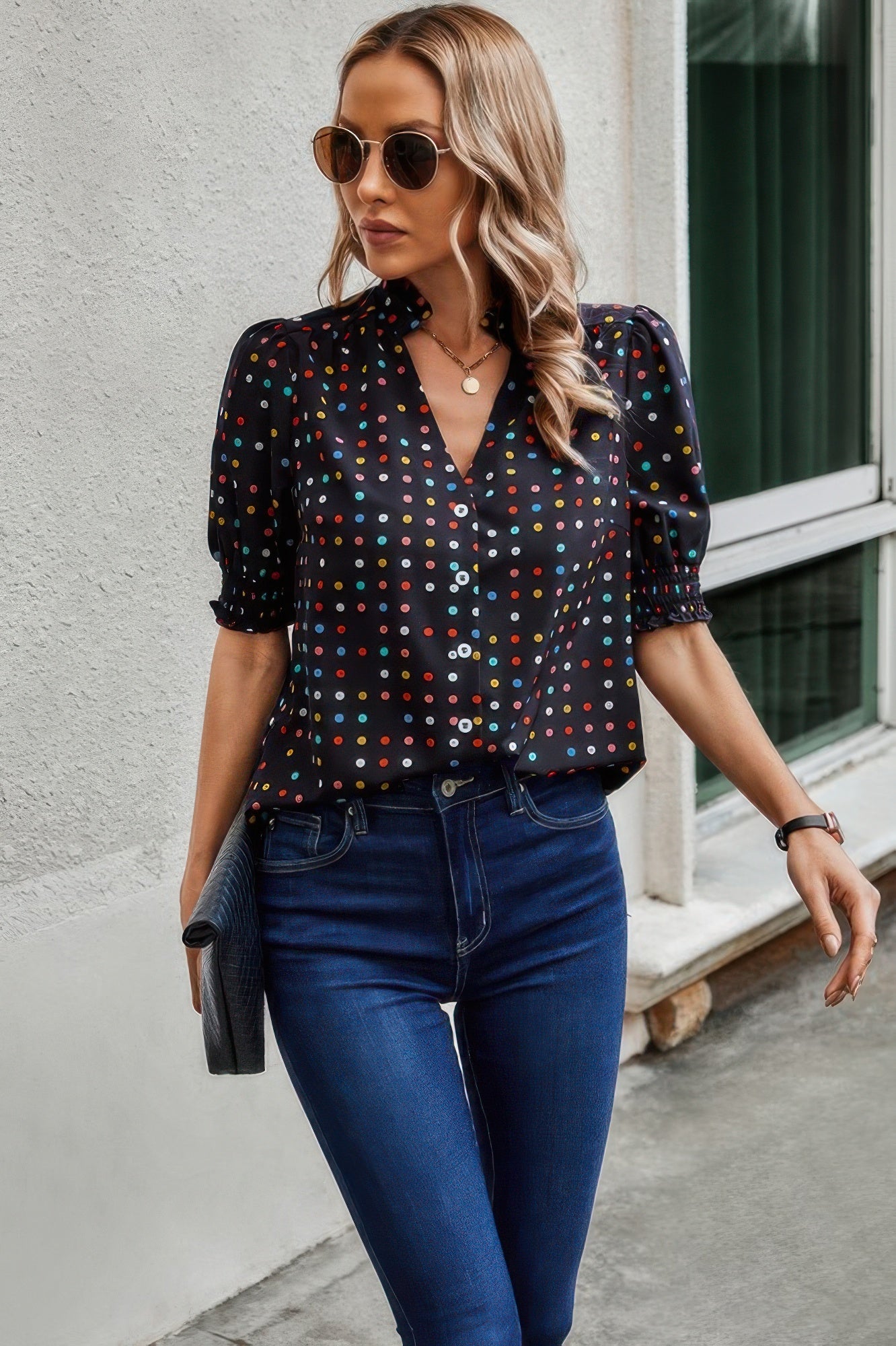 This polka dot print puff sleeve loose shirt brings a touch of playful sophistication to your wardrobe. Crafted from a soft blend of 95% polyester and 5% elastane, it offers a lightweight and stretchy feel for effortless comfort. The charming polka dot pattern adds a hint of retro-inspired style, while the puff sleeves create a soft, romantic silhouette. Its loose fit drapes beautifully, making it a versatile choice for casual outings, school days, or vacation adventures. Pair it with your favorite jeans or skirts for an effortlessly chic look.