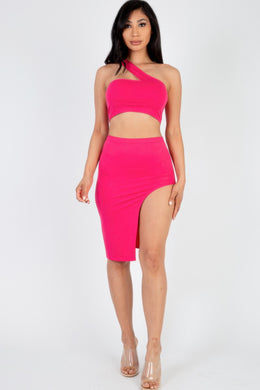Sexy Solid One Shoulder Crop Top & Split Thigh Midi Skirt Set