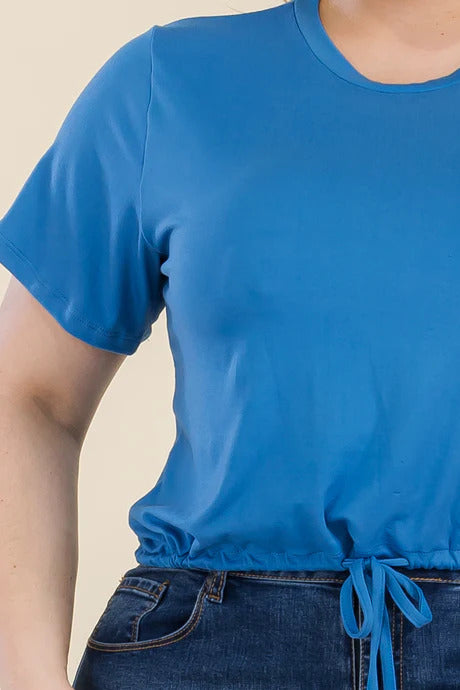 Plus size tie front drawstring short sleeve crop top from Capella Apparel, great for casual and basic wear