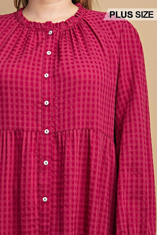 Upgrade your wardrobe with our Plum Allure Plaid Maxi Dress, a captivating blend of comfort and style. This button-down dress features a hi-low hem, combining the timeless appeal of plaid with a contemporary and flattering design.