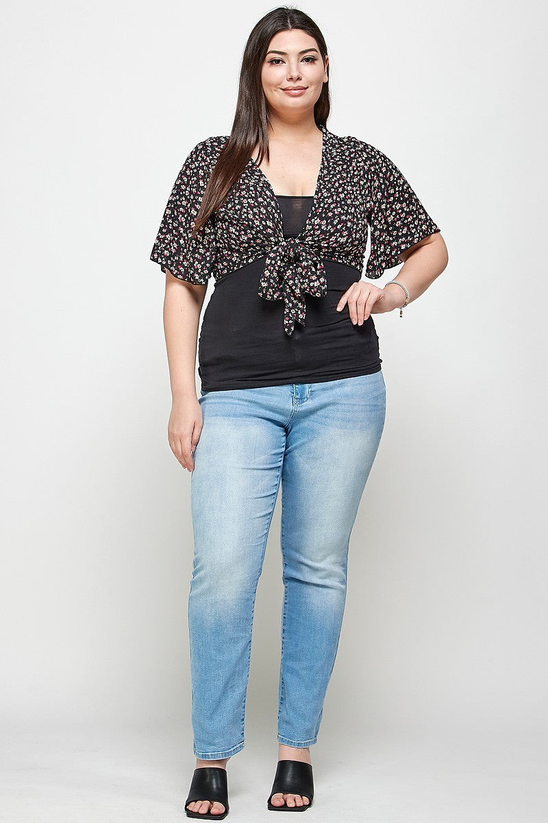 Plus size, ditsy floral print, cropped bolero cardigan, with short flyaway sleeves, v-neck, and adjustable tie
