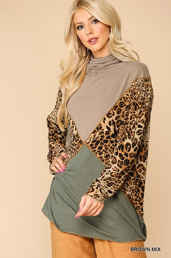 Imported S.M.L Solid and Animal Print Mixed Knit Turtleneck Top with Long Sleeves 67% Polyester 29% Rayon 4% Spandex Brown Mix GIG